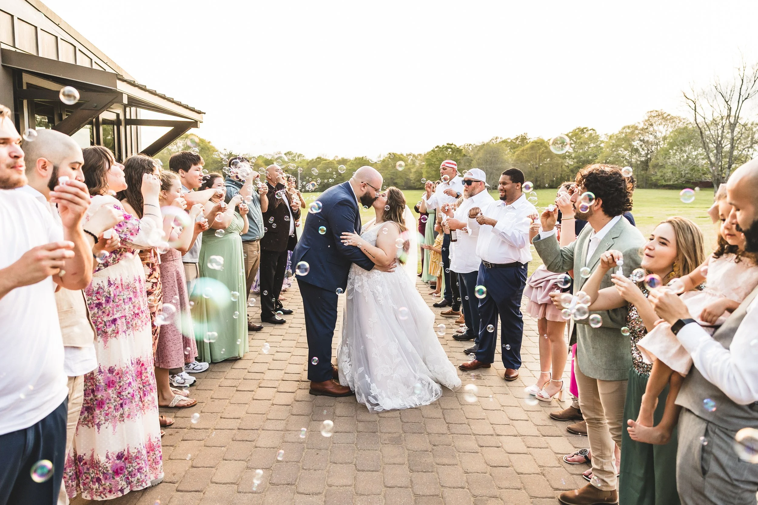 As the night came to a close, guests lined up outside the barn with bubble wands in hand. Jarrod and Elizabeth ran through a tunnel of bubbles, laughing and holding each other close. This magical moment captured the joy and love of their entire celebration.